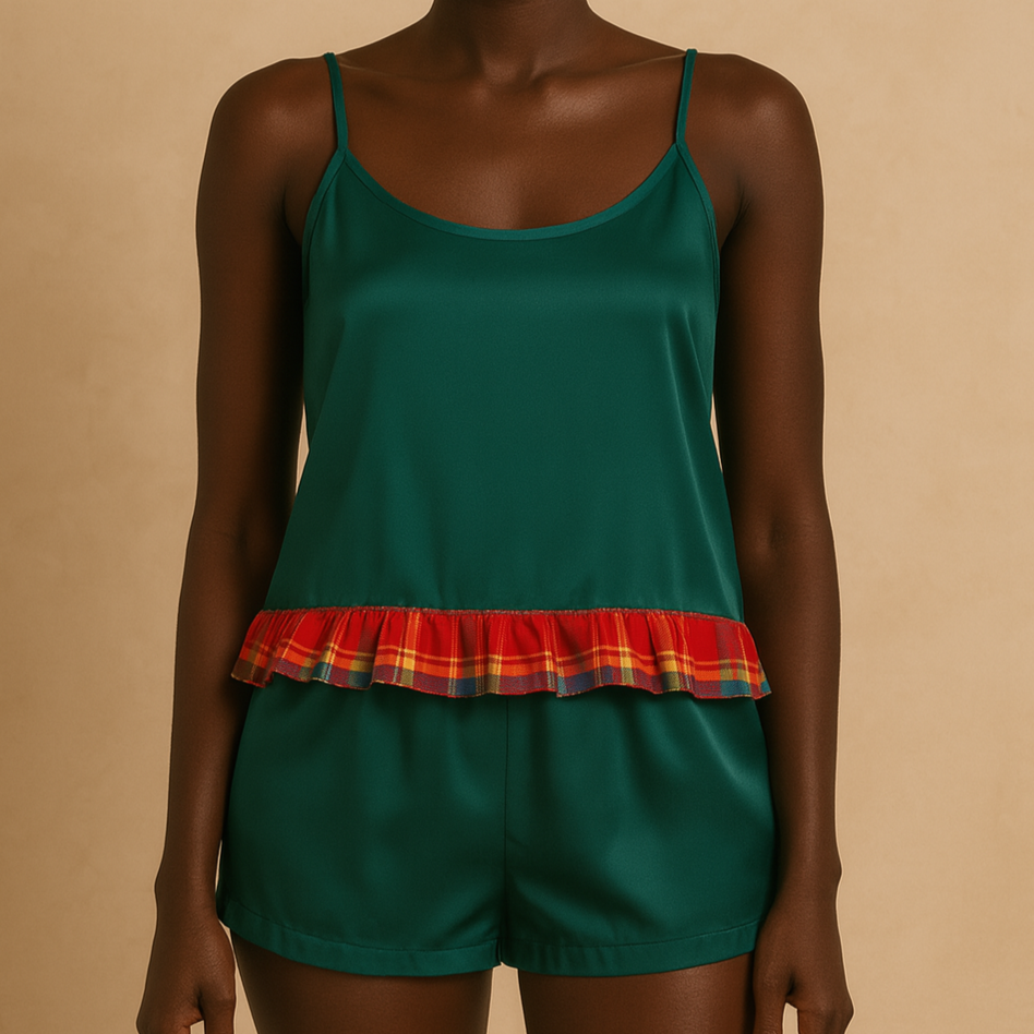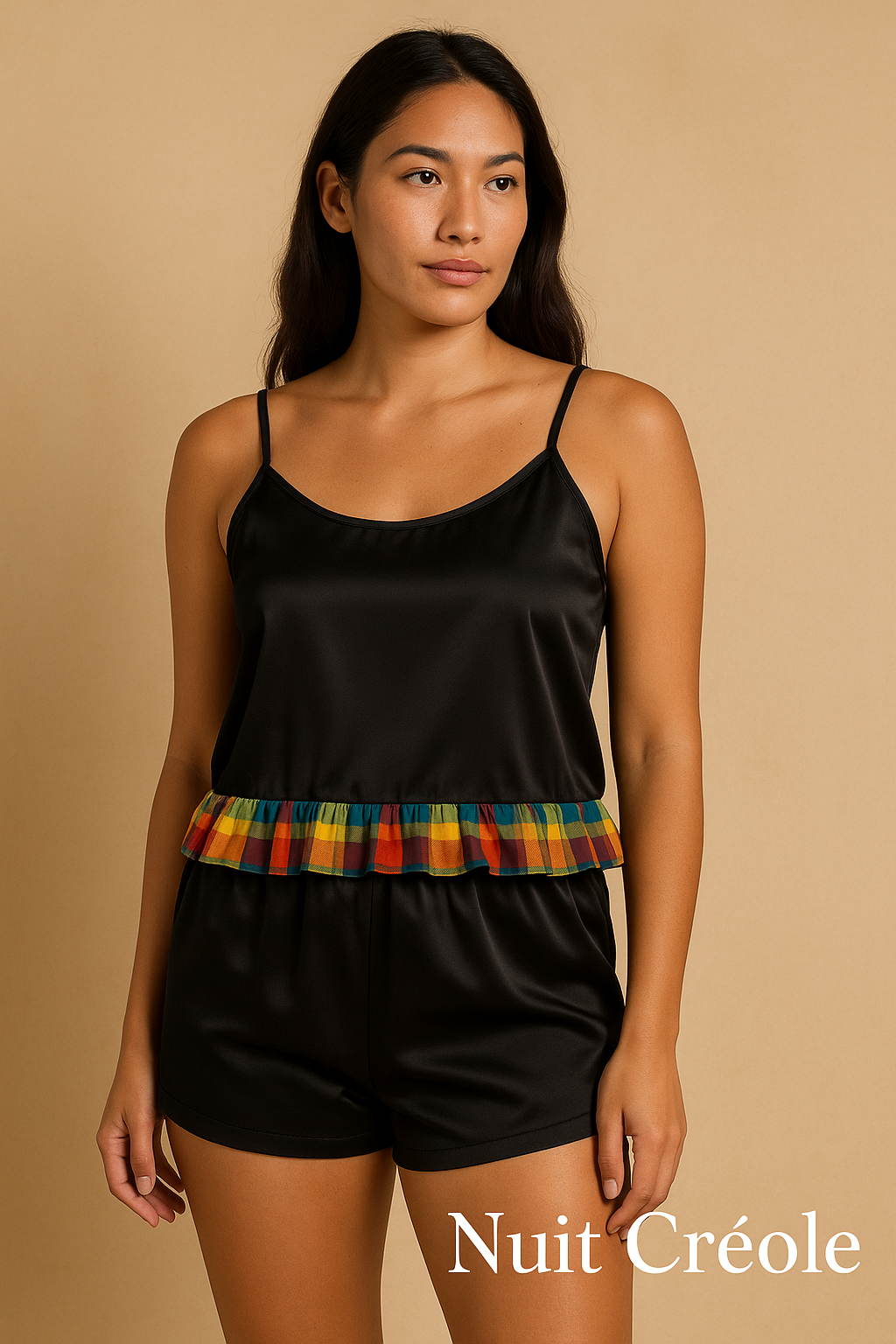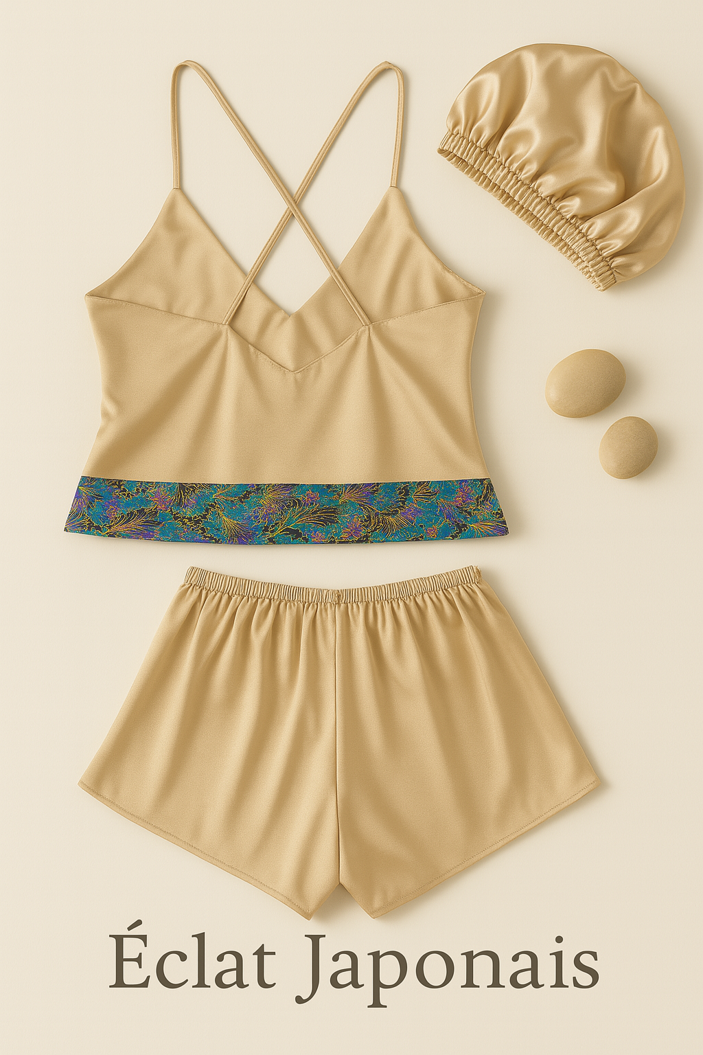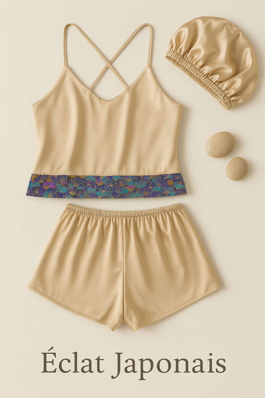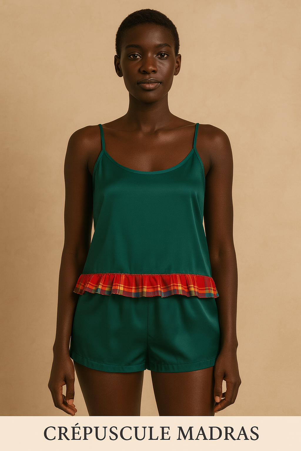 Crépuscule d’Étoffes est une collection d’ensembles de nuit raffinés, conçus pour allier confort et élégance dans l’intimité. Chaque modèle associe un tissu principal uni et satiné à une bande froncée en tissu traditionnel – madras, wax, chirimen japonais ou tissu océanien – délicatement placée en ceinture du haut, et parfois assortie à un chouchou ou une pochette.