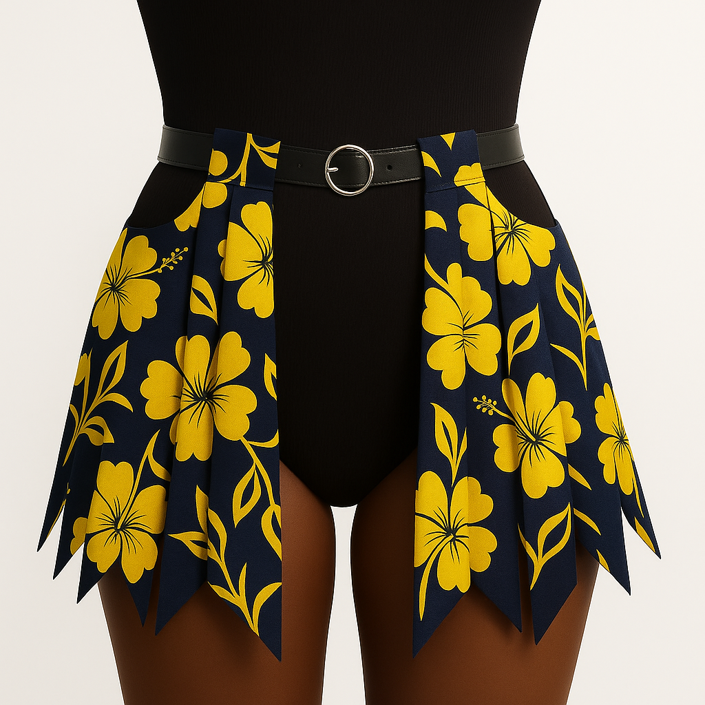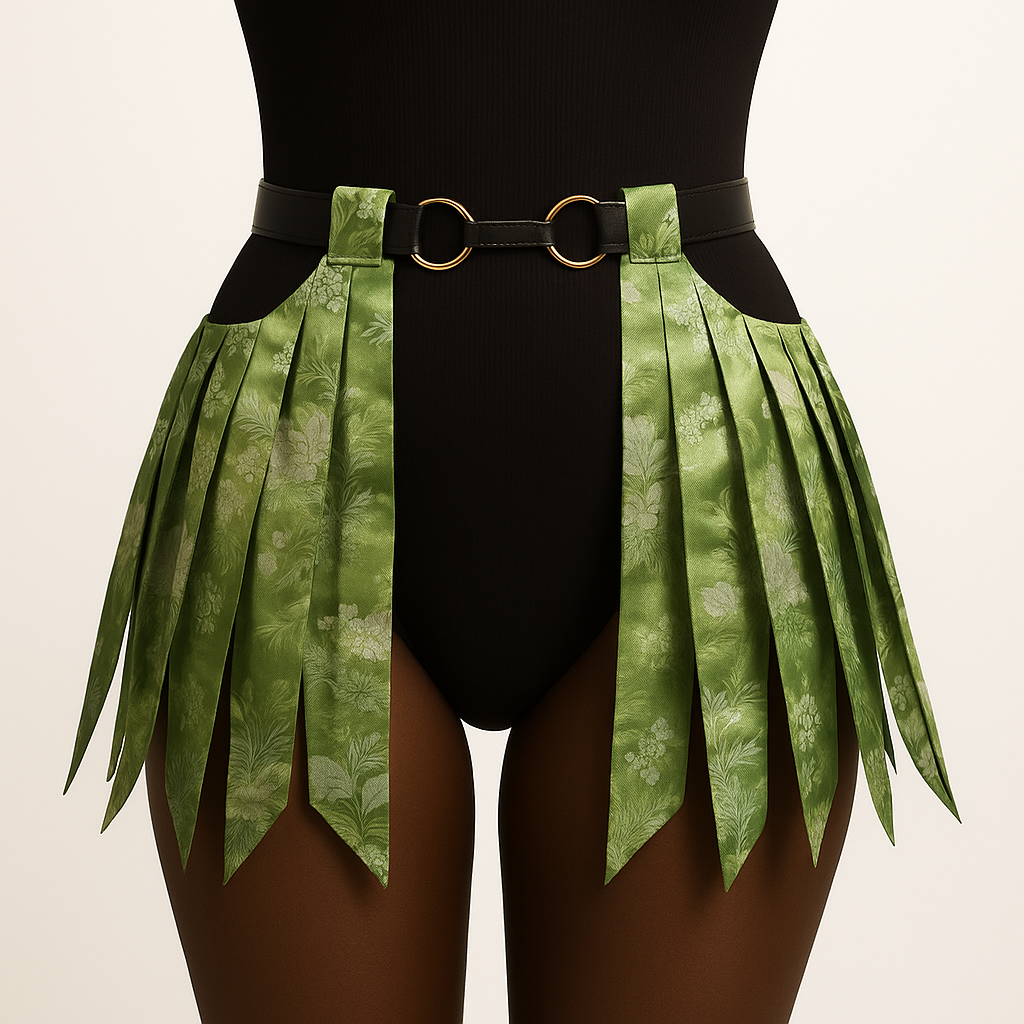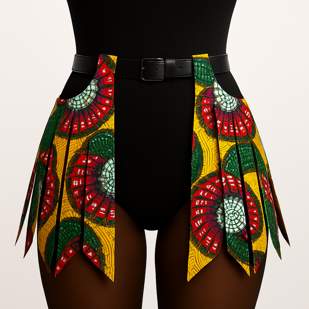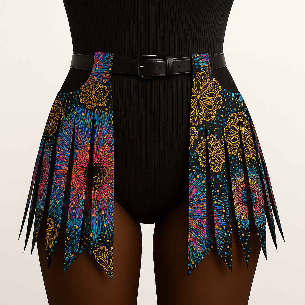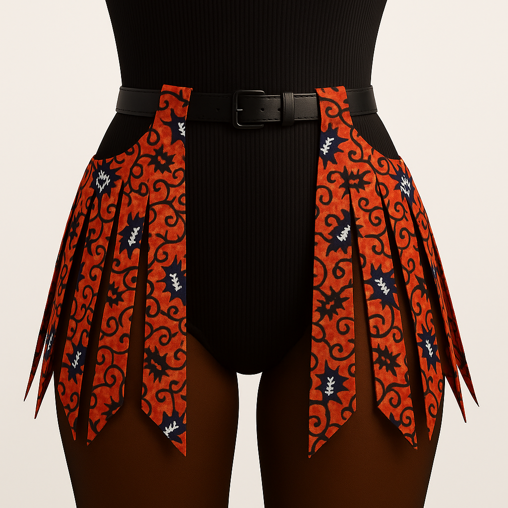 La ceinture- franges Cadence est un accessoire textile amovible en tissu océanien, transformant une simple ceinture en bijou de hanches unique. Ses franges longues et taillées en V subliment les courbes avec élégance.