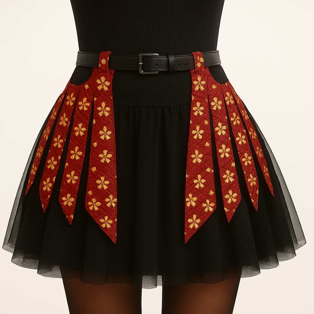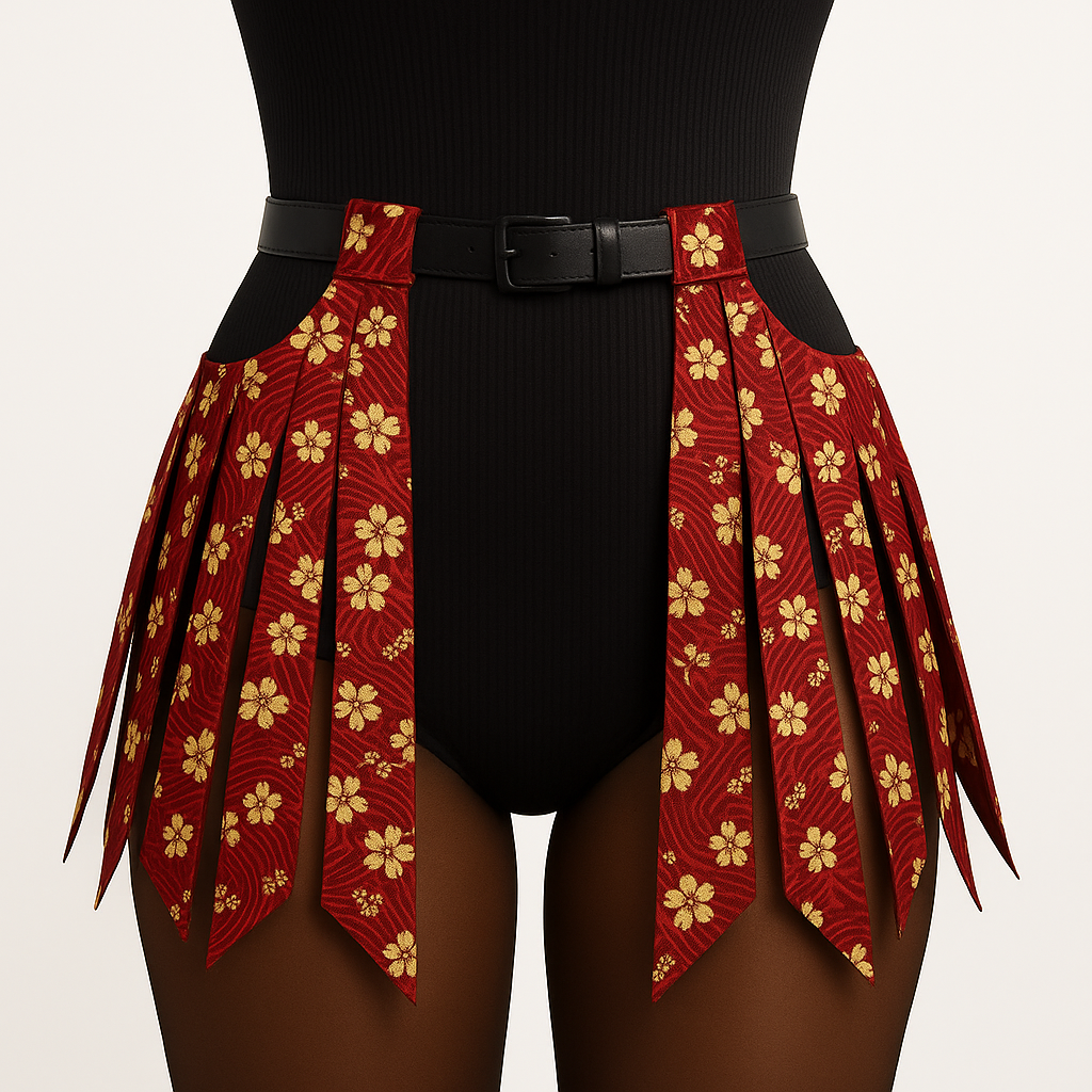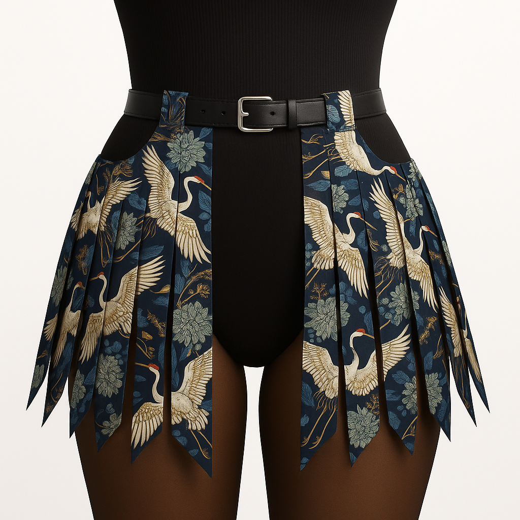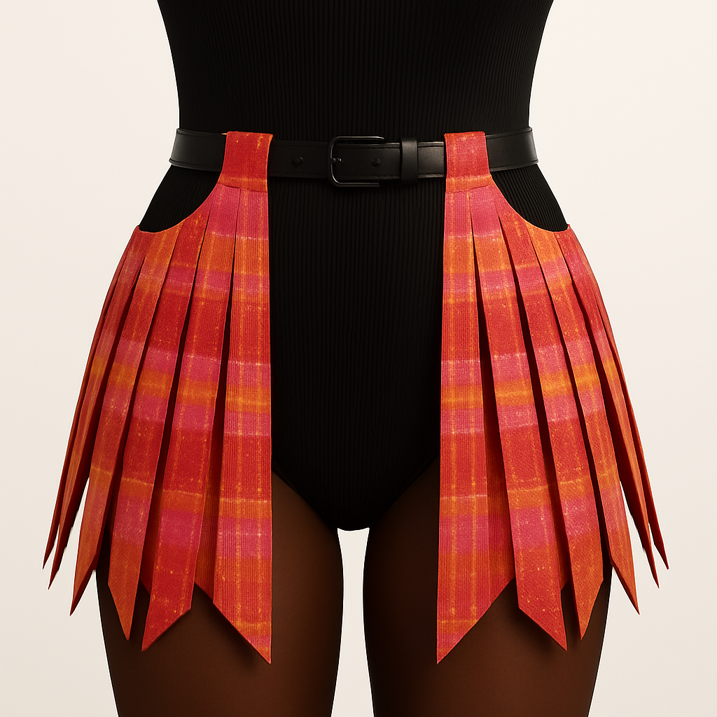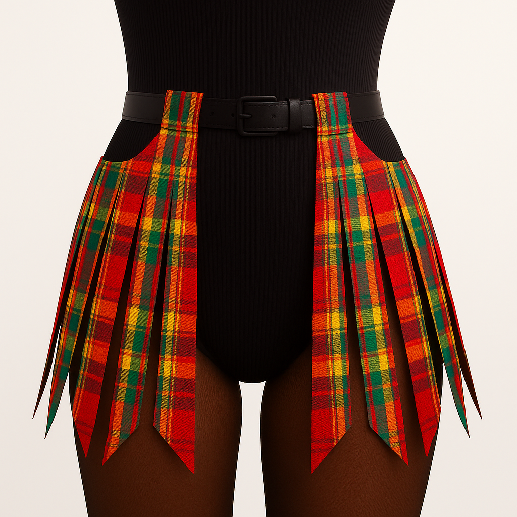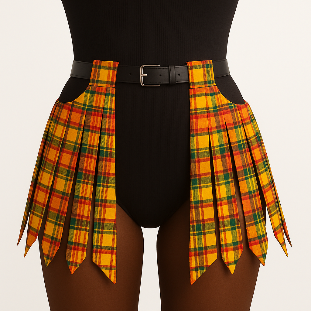 La ceinture- franges Cadence est un accessoire textile amovible en tissu océanien, transformant une simple ceinture en bijou de hanches unique. Ses franges longues et taillées en V subliment les courbes avec élégance.