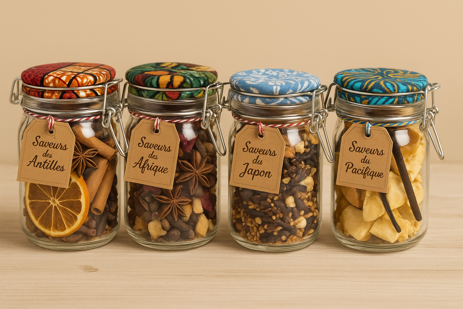 Sous leurs tissus du monde – madras, wax, chirimen japonais ou étoffes océanes – ces petits bocaux renferment bien plus que des épices.